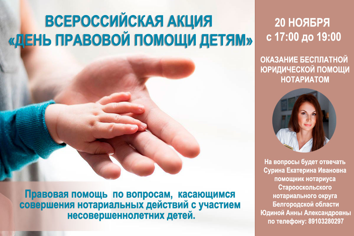 20 ноября нотариусы Белгородской области приняли активное участие в общероссийской акции – во Всероссийском едином дне оказания бесплатной юридической помощи, приуроченном ко Дню правовой помощи детям.